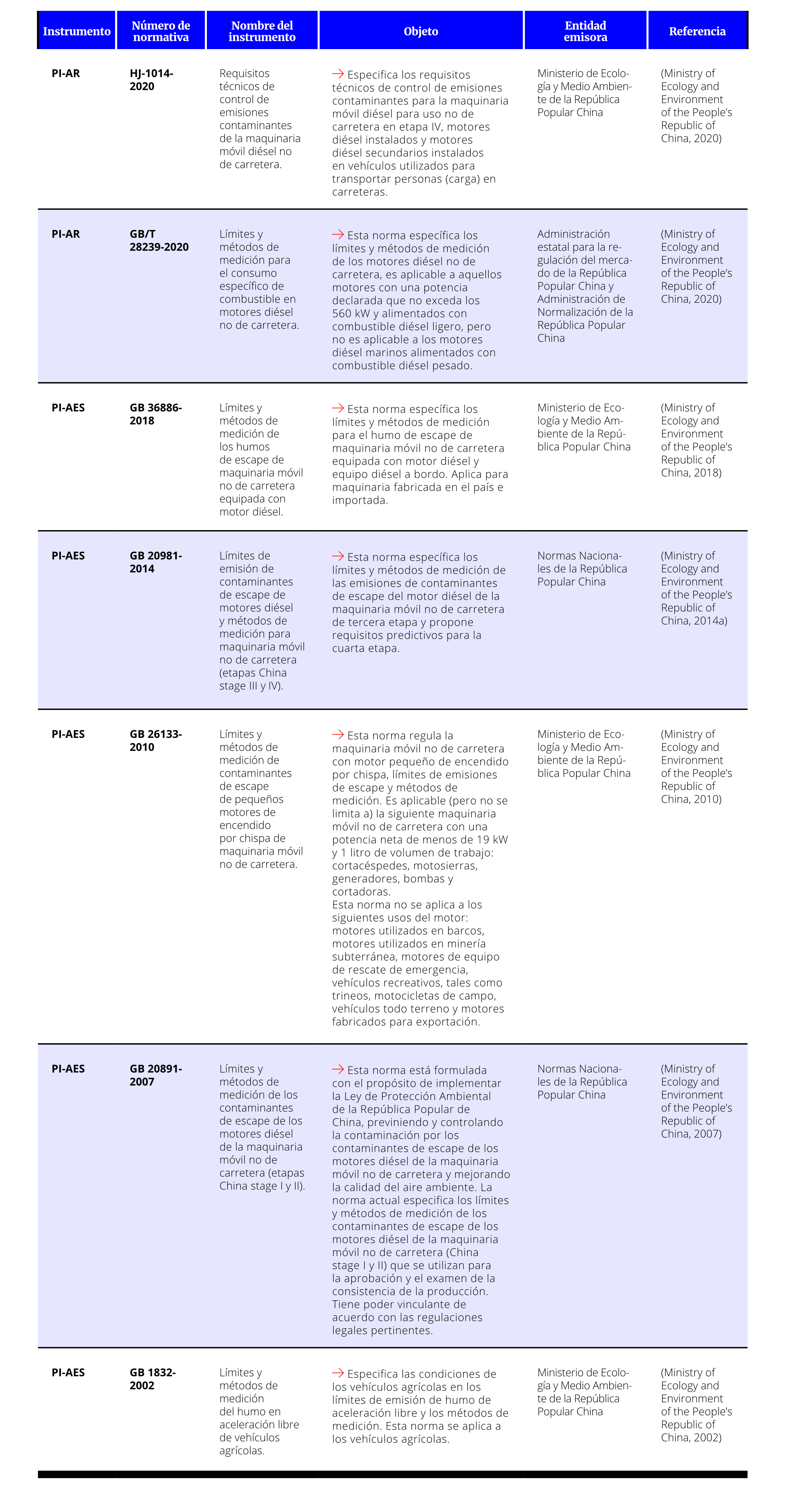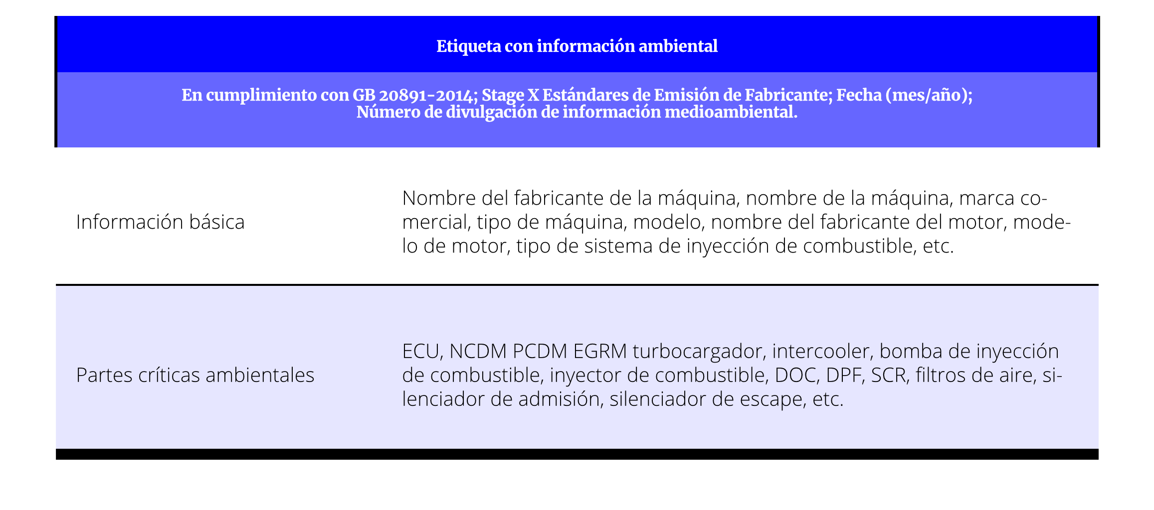 La maquinaria fabricada o importada, deberá reportar la información establecida en la regulación GB 20891-2014 (Ministry of Ecology and Environment of the People’s Republic of China, 2014), específicamente en el Anexo A del estándar. Los fabricantes e importadores de maquinarias con rangos de potencia menores o iguales a 560 kW, deberán cumplir con los requerimientos de la regulación HJ 1014-2020.