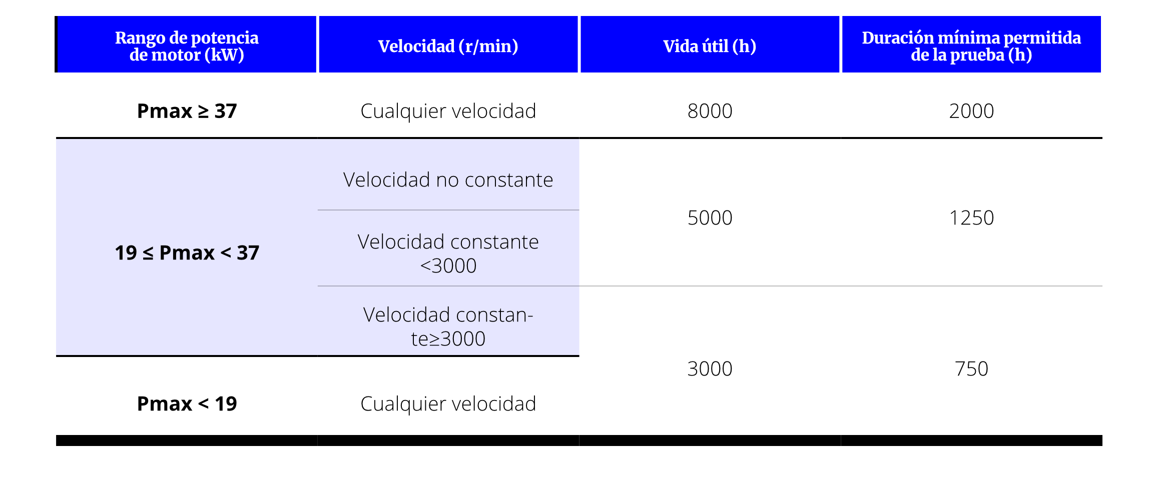 Los tiempos de prueba de durabilidad de motor de acuerdo con la regulación GB 20891-2014, no deben ser menores al 25% del tiempo de vida útil del motor especificado en Tabla 9. 3 (Ministry of Ecology and Environment of the People’s Republic of China, 2014b). Por otro lado, la entidad que realice las pruebas de durabilidad podrá elegir de manera aleatoria el tipo de prueba que se ajuste a los tiempos definidos en la tabla que se presenta a continuación.