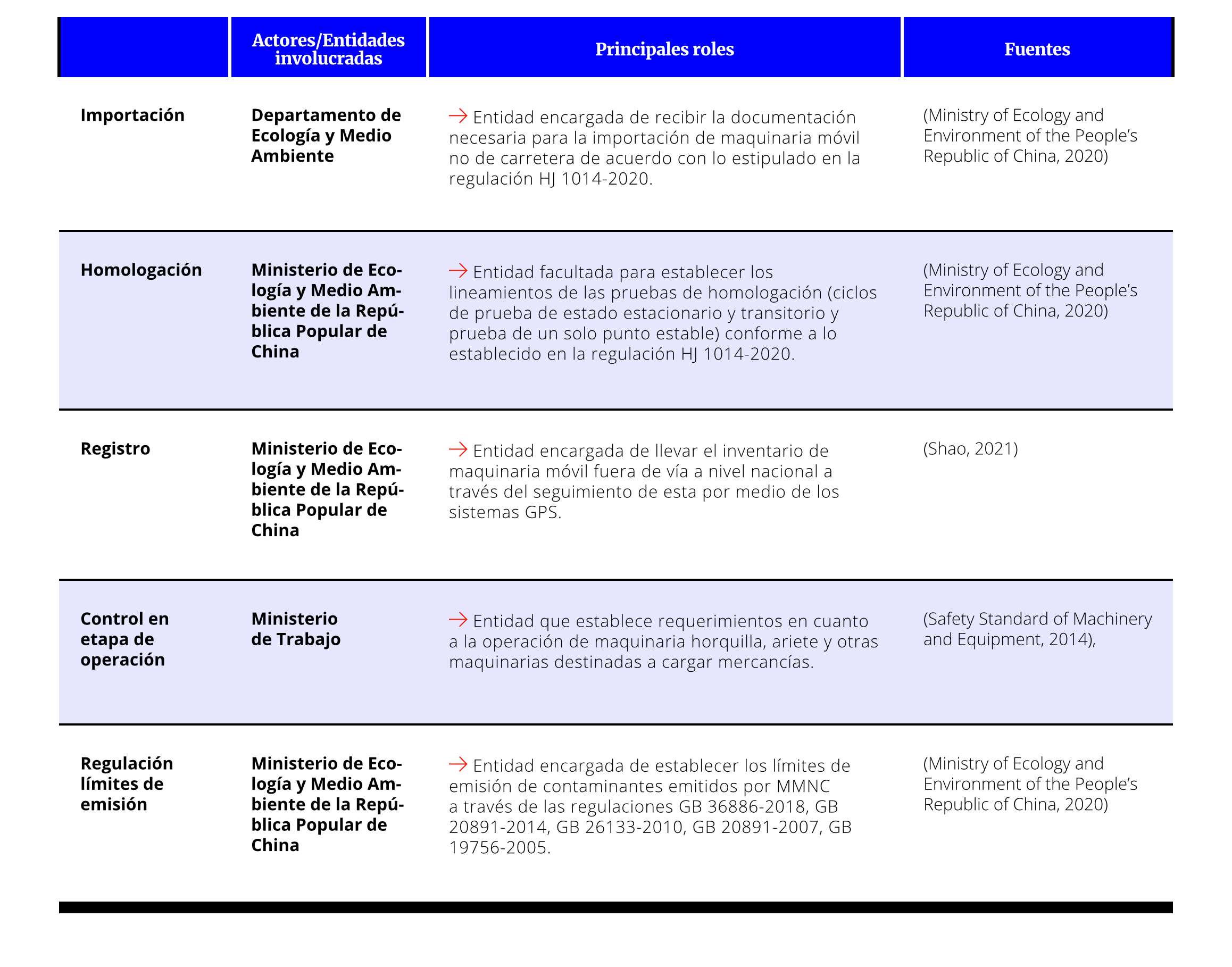 Las regulaciones en China abarcan los procesos de inspección de año modelo, fabricación, emisión de contaminantes atmosféricos, inspección en uso y durabilidad de las máquinas móviles no de carretera (equipos o motores) (Ministry of Ecology and Environment of the People’s Republic of China, 2020).