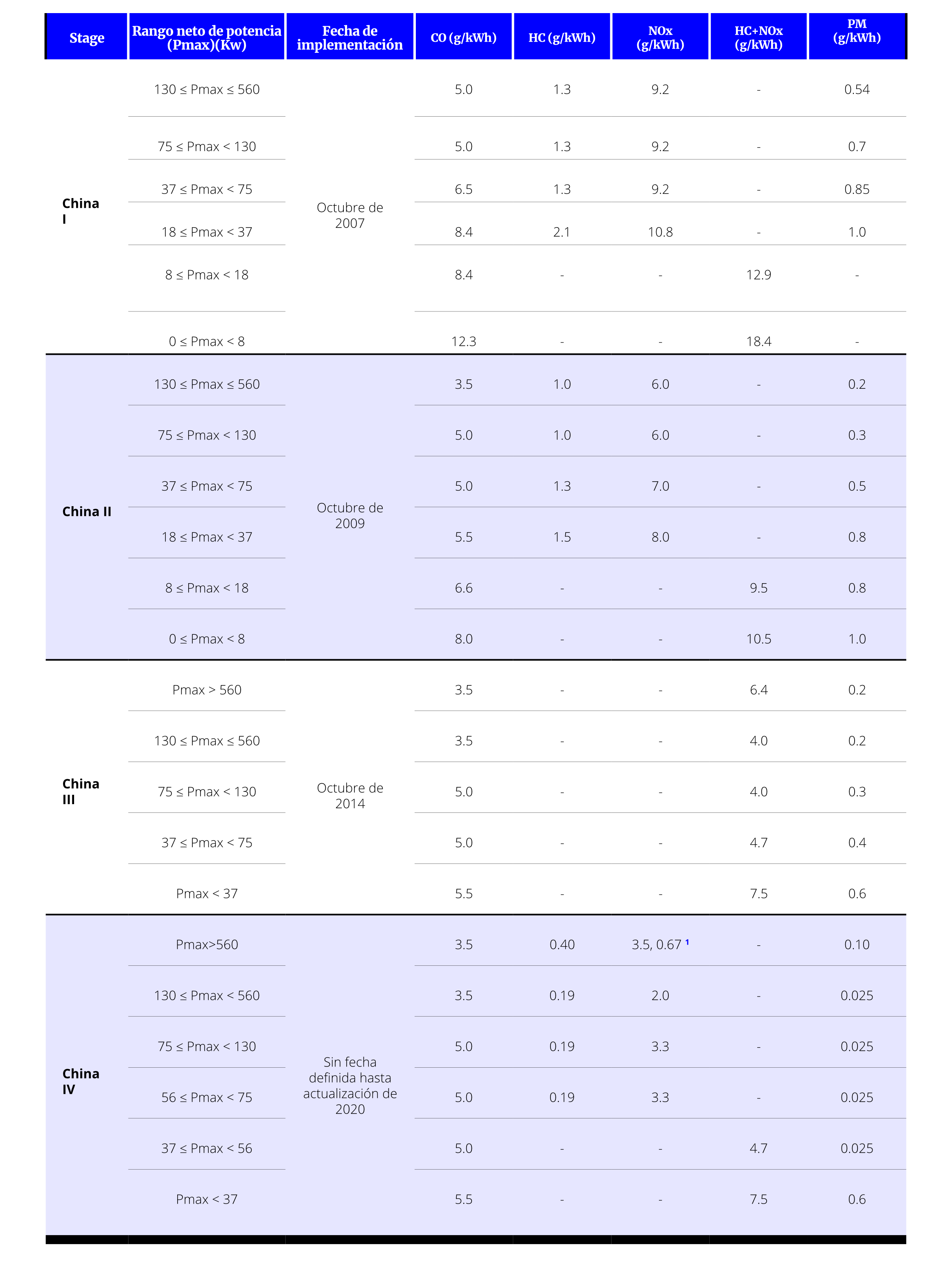 En 2020, el gobierno de China actualizó la normativa para emisiones de MMNC, las nuevas normas, cuya aplicación prevista para diciembre de 2022, serán equivalentes a los límites de Stage IIIB pero mejoradas para cumplir algunos requisitos de las normas Euro Stage V (ICCT, 2021), análisis disponible en: https://theicct.org/publications/china-iv-non-road-emission-standards-jul2021