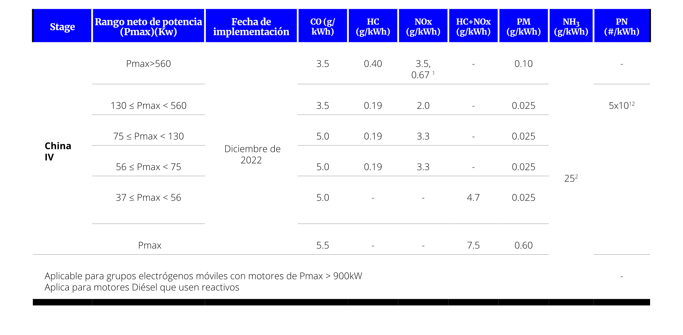 Posteriormente, en 2014 el Ministerio de Ecología y Ambiente de la República Popular China definió los límites y métodos de medición para contaminantes de motores diésel de MMNC para los estándares China III y IV (equivalentes a los europeos Stage IIIA y Stage IIIB, respectivamente) según la regulación GB 20891-2014. Sin embargo, aunque la implementación gradual de los estándares China III comenzaría desde octubre de 2014, la fecha de implementación de los estándares China IV no había sido definida hasta la enmienda o actualización de su regulación que ocurrió en el año 2020, en donde estos estándares China IV han quedado programados para su exigencia desde diciembre de 2022 y serán equivalentes al Stage IIIB europeo pero con actualizaciones que incluyen, además de límites de emisión para NH3 y PN, el uso de sistemas portátiles de medición de emisiones (PEMS) durante la operación de los motores, sistemas de diagnóstico de NOx y partículas (NCD y PCD respectivamente), instalación de sistemas de GPS, monitoreo remoto de emisiones para equipos entre 37 y 560 kW y requerimientos de etiquetado para MMNC según lo describe el informe The updated China IV non-road emission standards del ICCT (ICCT, 2021), de manera que se cumplan algunos de los requerimientos que caracterizan a los estándares Stage V de actual implementación para la Unión Europea.