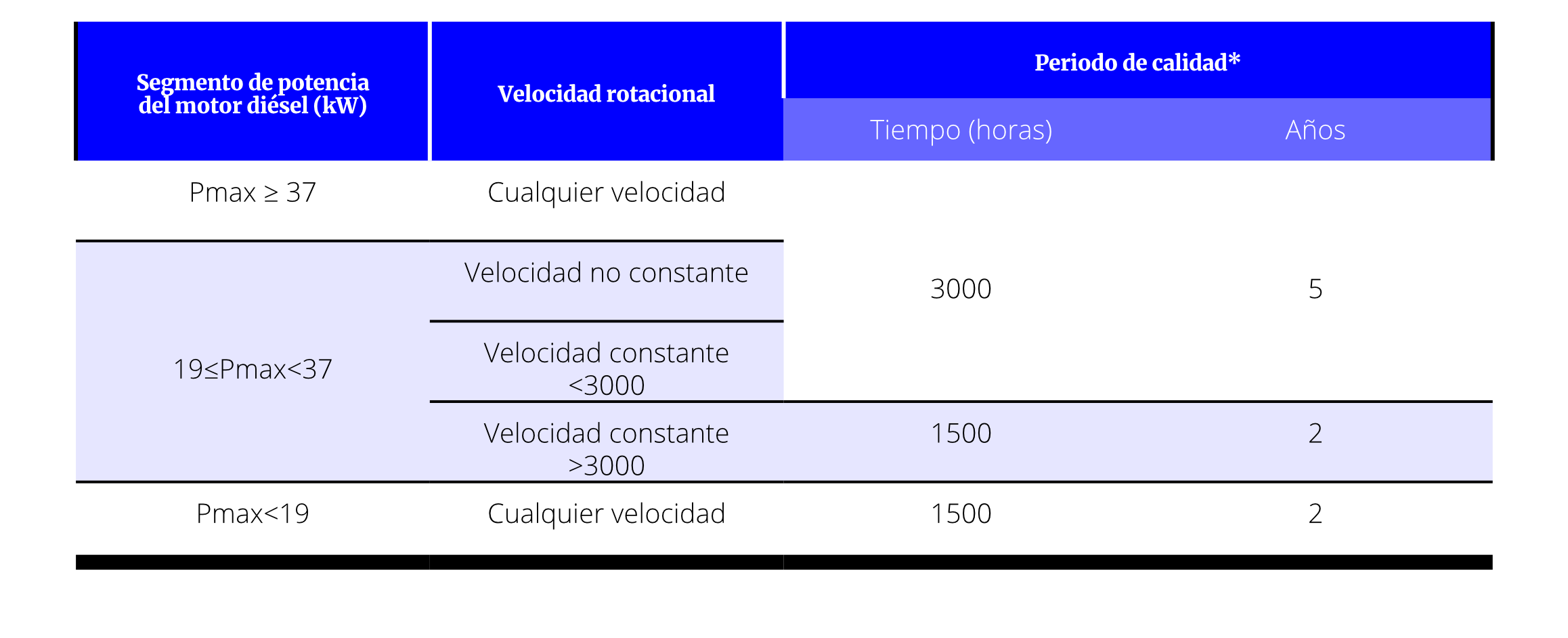 El tiempo máximo de servicio de la maquinaria se especifica en el Artículo 5.2.2 de la regulación GB 20891-2014. Éste asegura el funcionamiento normal de motores diésel de MMNC y sus sistemas de control de emisiones (si los hubiera) para cumplir con los límites de emisión de contaminantes gaseosos y partículas y que ha sido confirmado en la homologación (Ministry of Ecology and Environment of the People’s Republic of China, 2014b).