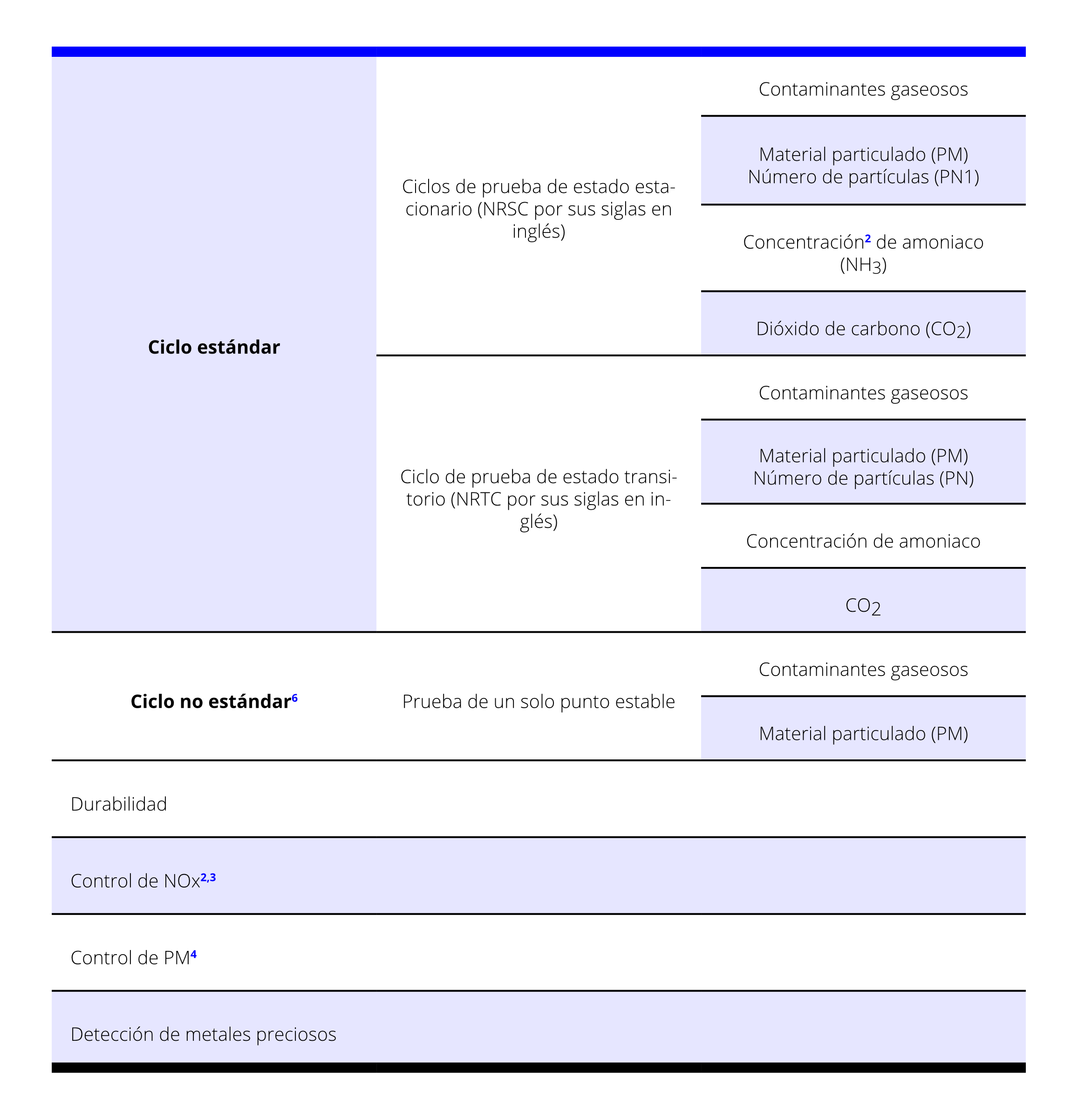 Los factores de deterioro según la actualización de 2020 para los estándares China IV que entrarían en rigor desde el año 2022, se generaron en función de pruebas de motores diésel en operación real y corresponderán a 1.3 para CO, 1.3 para HC, 1.15 para NOx, 1.05 para PM, 1.0 para PN y 1.0 para NH3. La propuesta de estos factores de deterioro tiene el objetivo de reducir potencialmente los costos de prueba de los fabricantes, de manera que estos hagan uso de su aplicación directamente en lugar de determinar valores de ensayos de durabilidad de los equipos, lo cual normalmente requeriría que prueben sus motores durante La MMNC equipada con motores diésel, con rango de potencia neta de 37 kW a 560 kW, deberá contar con filtro de partículas diésel (DPF) o un sistema de control más eficiente de remoción de partículas. un ciclo de trabajo representativo (en condiciones reales de operación que incluirían conducir y realizar trabajos como levantar carga) de una cuarta parte o más de la totalidad de la vida útil (ICCT, 2021). Según HJ 1014.2020 (2020) las pruebas de homologación se realizan en dinamómetros con ciclos de prueba de estado estacionario /4/ y estado transitorio /5/ . Las variables por considerar durante las pruebas incluyen temperaturaabsoluta (Ta) de la admisión del motor diésel expresados en Kelvin (K); presióndel aire seco (Ps), expresado en kPa y el factor de presión atmosférica enlaboratorio que será calculado siguiendo las fórmulas del Anexo B, secciónB.2.2.1. Otro tipo de pruebas realizadas son pruebas de durabilidad, control deNOx y control de PM. Un resumen del tipo de pruebas realizadas se describe en la siguiente tabla.