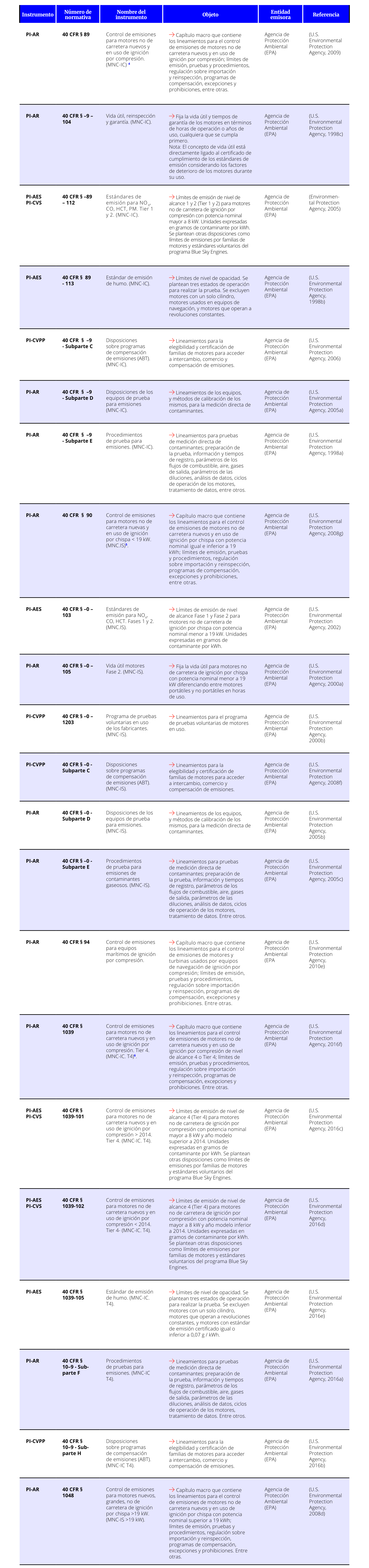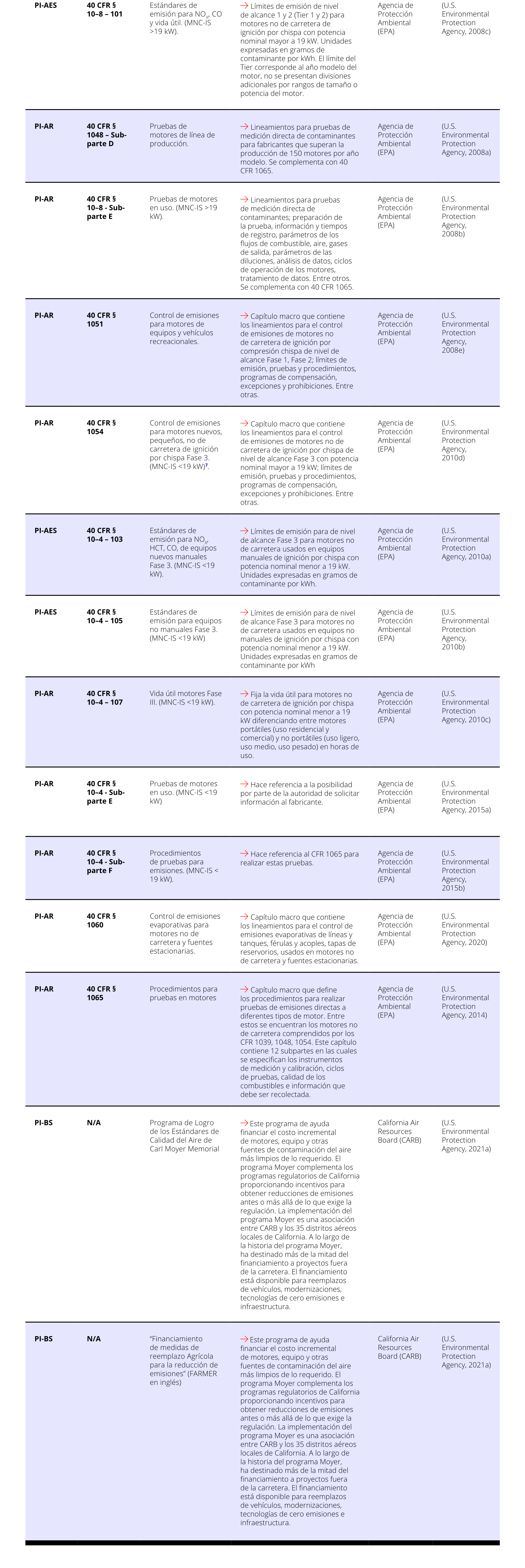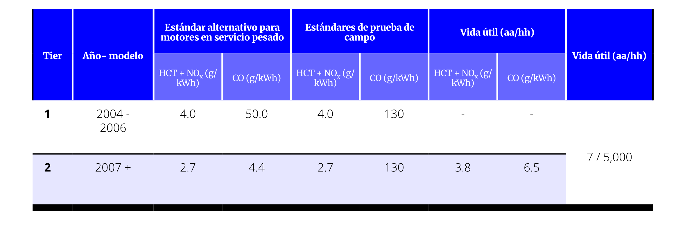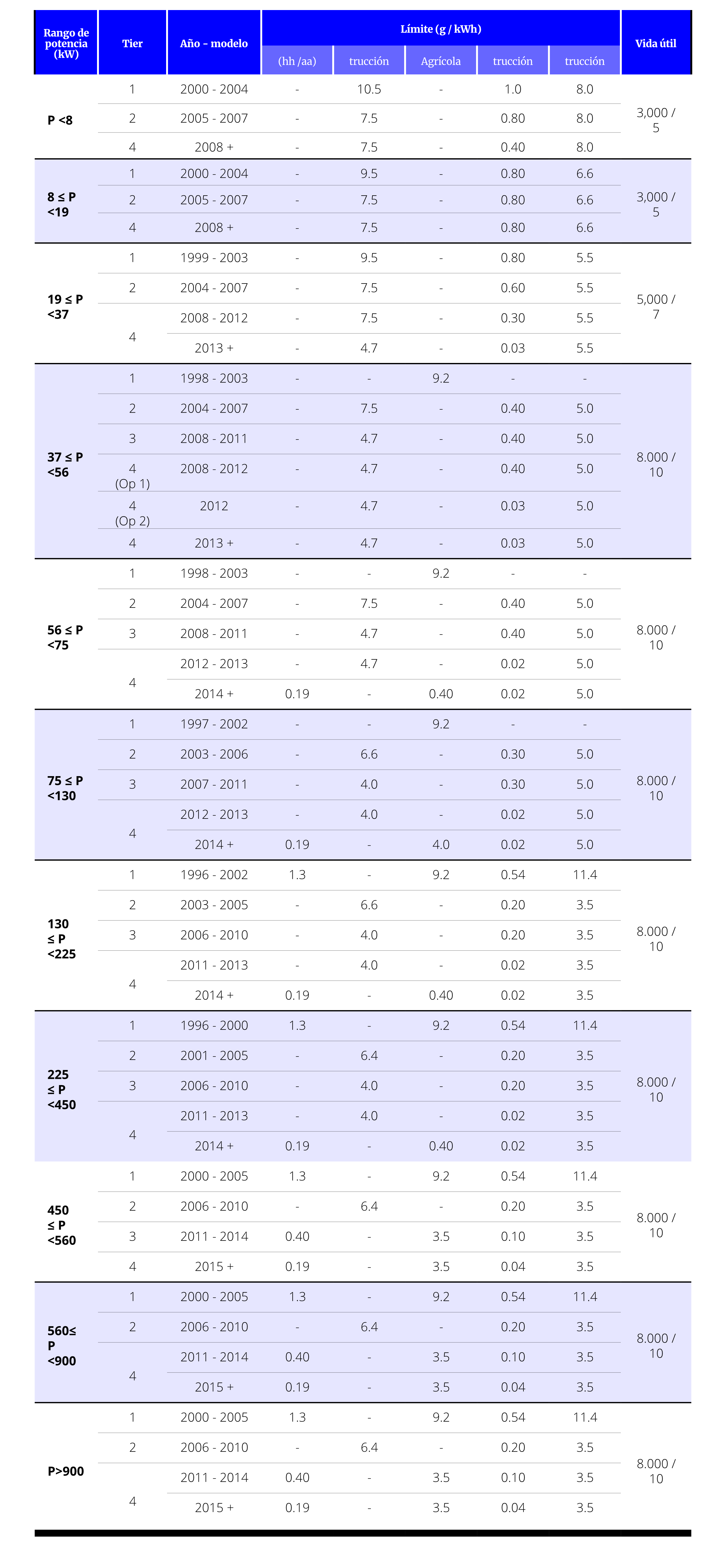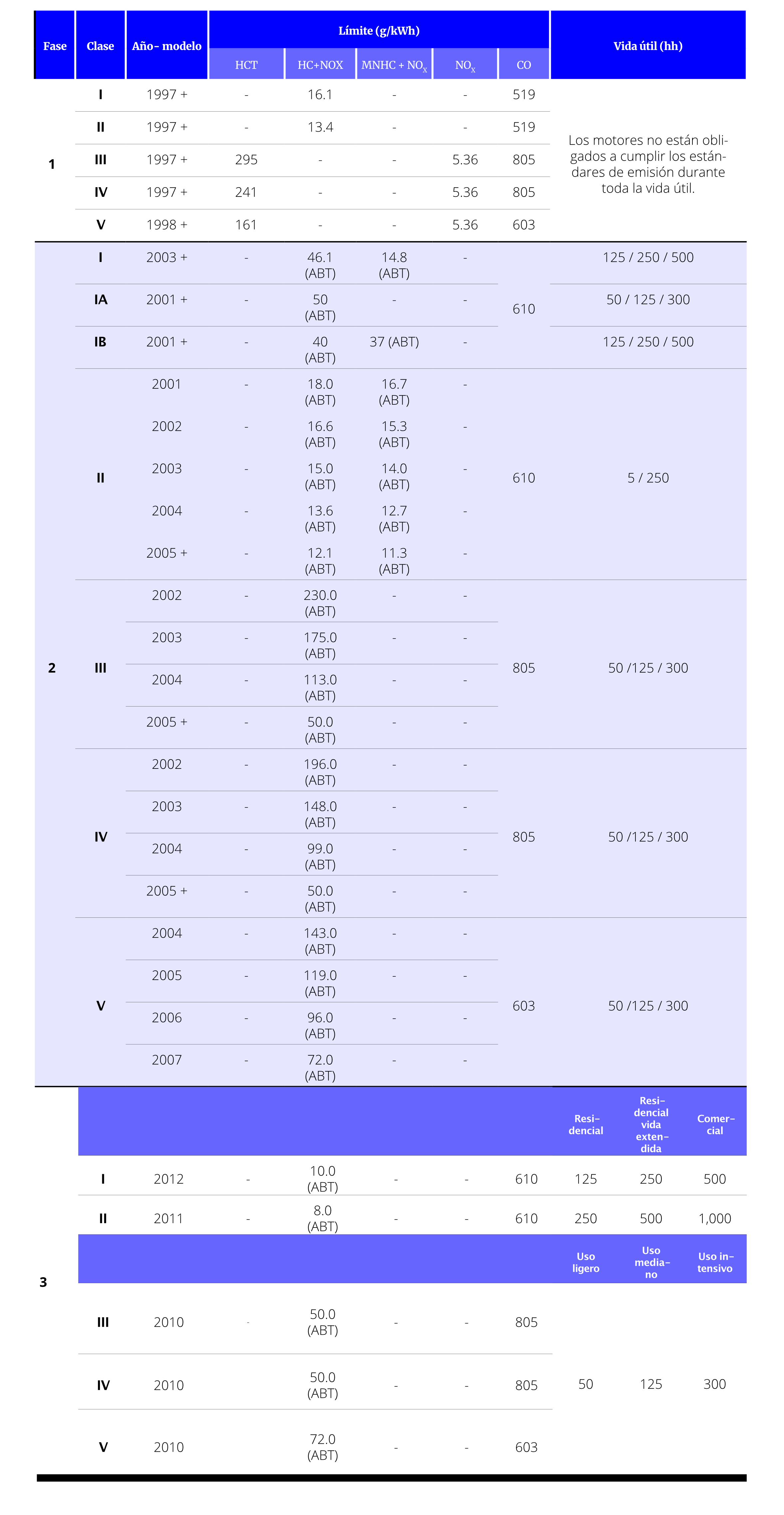 En las tablas a continuación se presentan los estándares de emisión y periodos de vida útil para las diferentes clasificaciones de motores regulados por Estados Unidos. La vida útil de los motores está establecida por el tiempo en operación de estos, ya sea en horas de uso o años de antigüedad, cualquiera que ocurra primero.