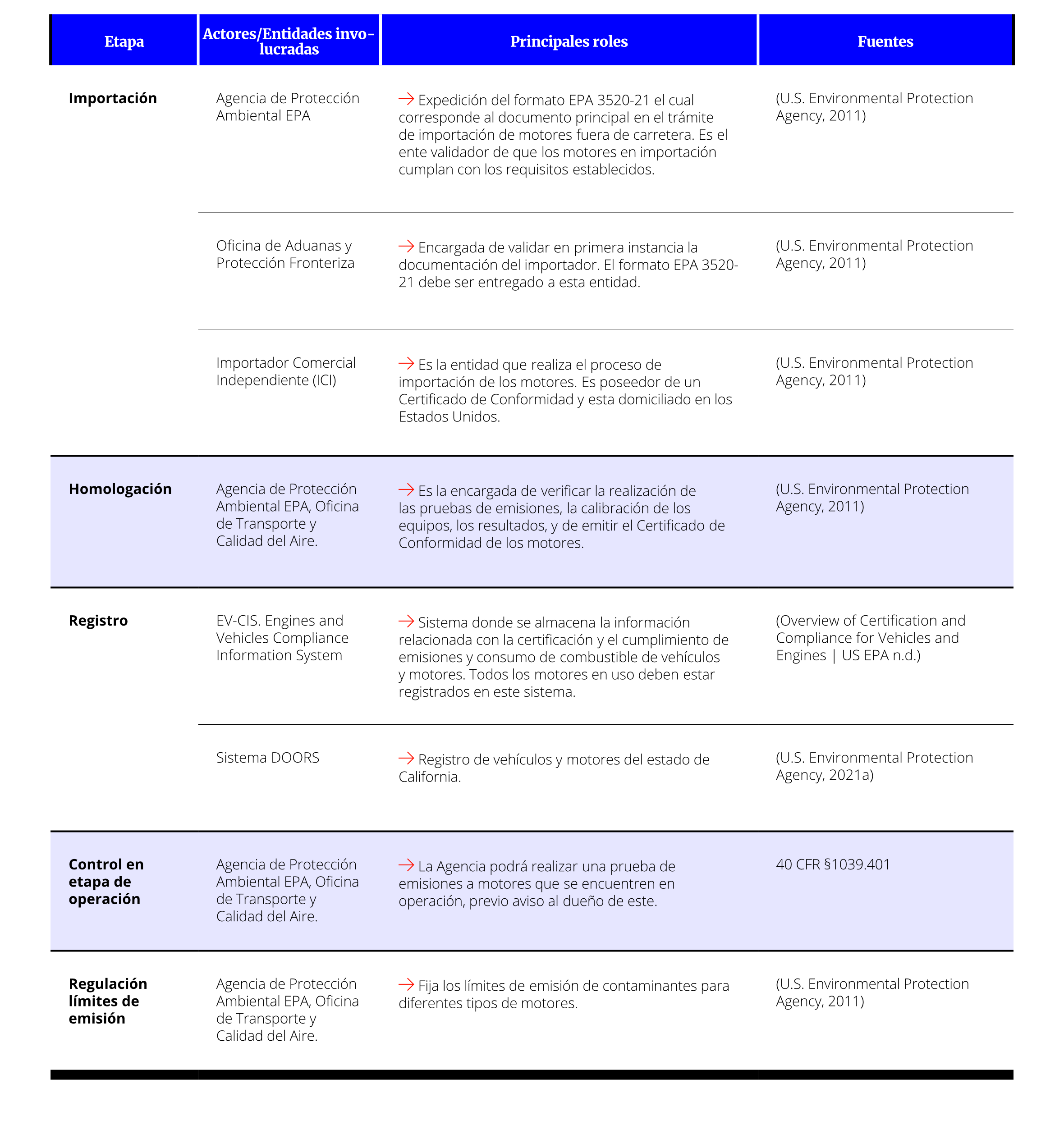 Los importadores deben presentar el Formulario 3520-21 y remitir la información a la Oficina de Transporte y Calidad del Aire de la EPA (EPA-OTAQ) y mantener guardados dichos documentos y soportes por al menos cinco años posteriores a la fecha Certificado de conformidad (COC): documento que la EPA emite a un fabricante de motores (OEM), o a un importador (ICI), para certificar que una familia de motor cumple con los requisitos de la EPA. de importación. En este formato se presentan 10 categorías de motores que pueden ser seleccionados. Los motores pueden ser importados como motores certificados de Estados Unidos, o motores instalados en vehículos certificados. De manera general, los motores que sean importados deben estar cubiertos por un Certificado de Conformidad, a menos que haya sido construido antes de la fecha de entrada en vigor de las regulaciones.