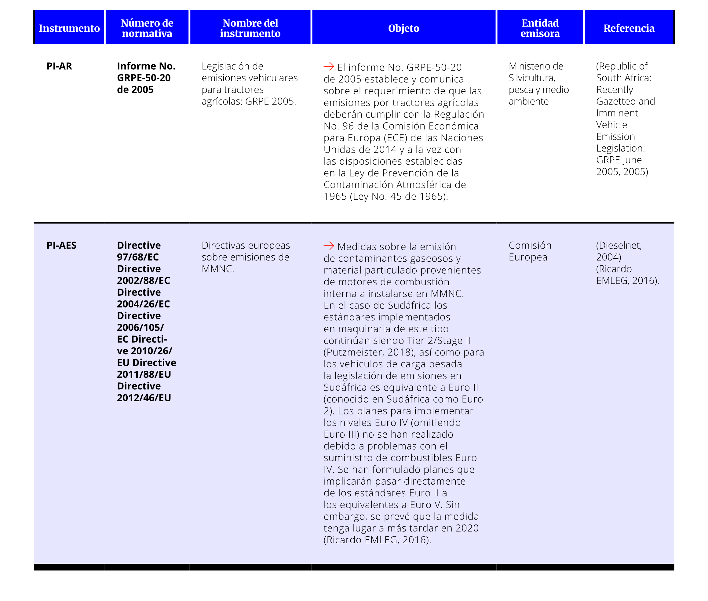 En la Tabla 1. se presenta una recopilación de diferentes tipos de instrumentos identificados en Suráfrica para el control de la contaminación atmosférica generada por la MMNC.