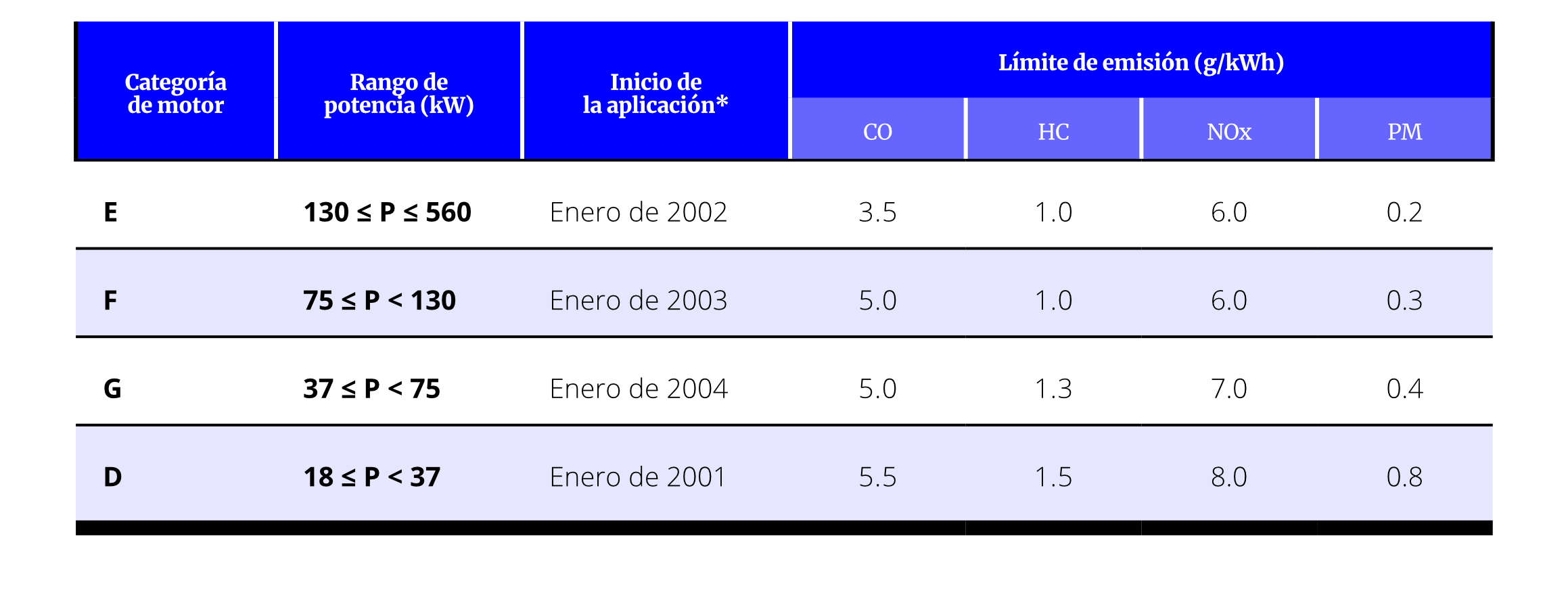 * Stage II también aplica para motores de velocidad constante desde enero de 2007.