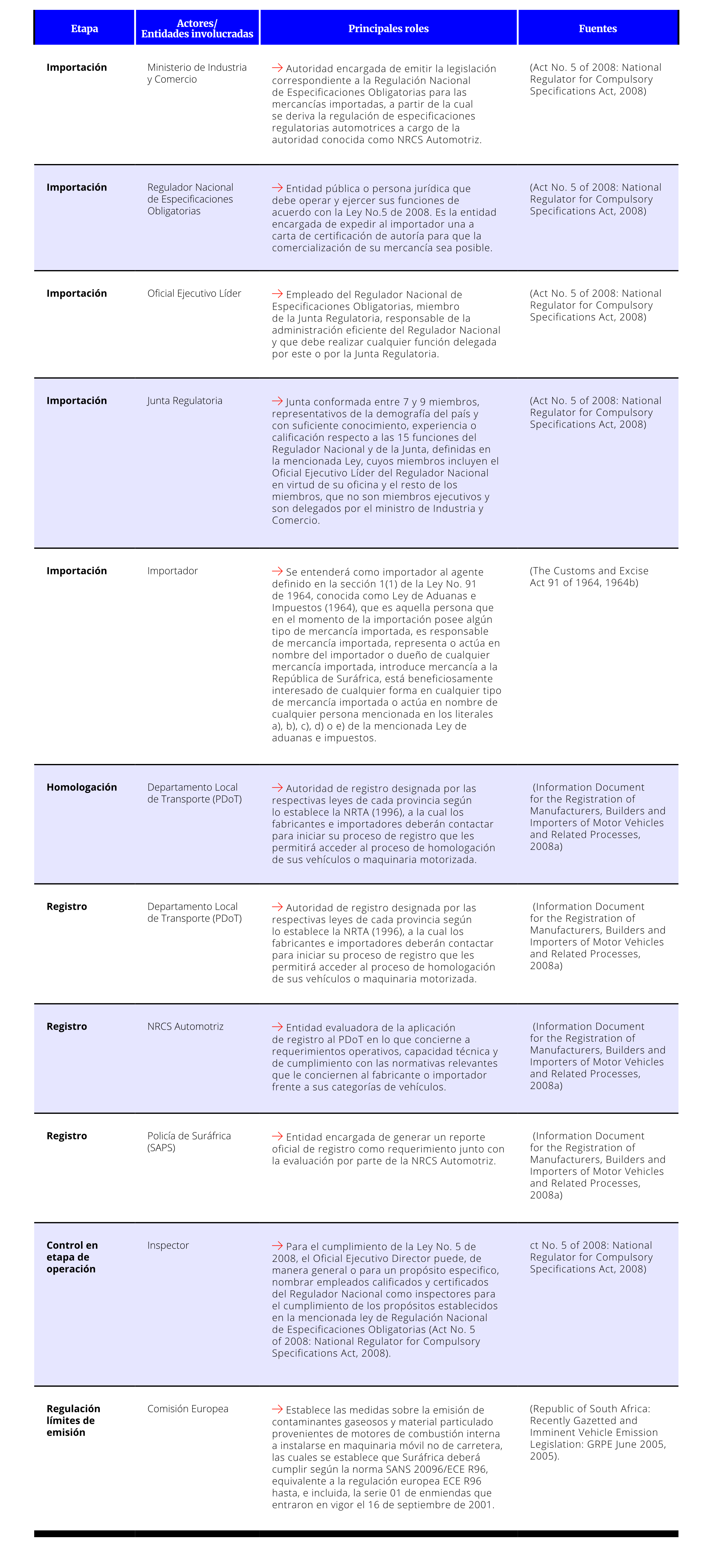 En la tabla a continuación se presentan los principales actores que intervienen en los procesos relacionados con MMNC en Suráfrica. Posteriormente se presentan aspectos complementarios sobre dichos procesos.